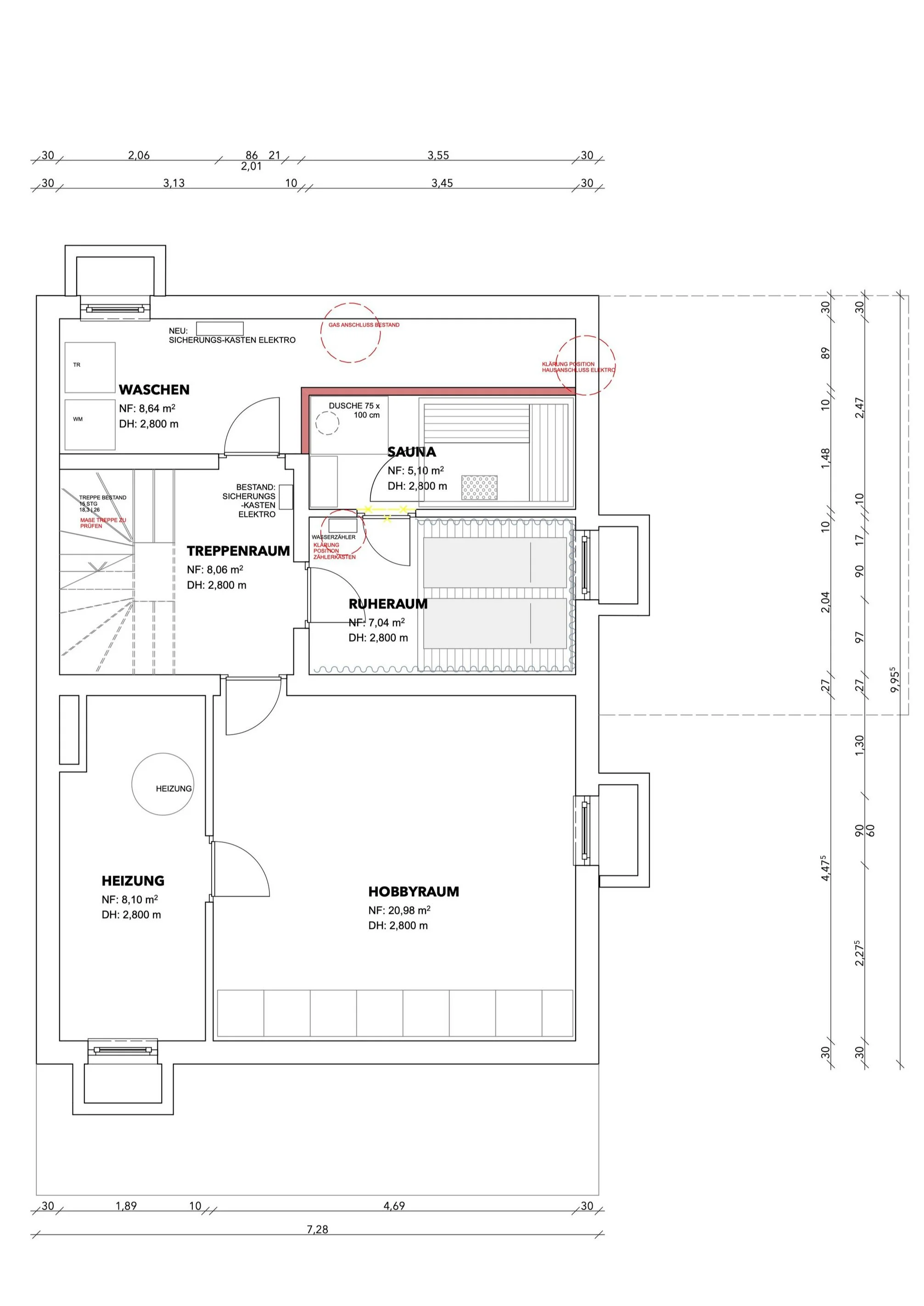 Die ehemals geschlossene Küche öffnet sich nun als moderne Kochzeile zum Wohnraum, während das einfach verglaste Wohnzimmerfenster einem großzügigen, energetisch sanierten Sitzfenster weicht. Die Terrassentür wurde erweitert, um mehr Offenheit und Nutzungskomfort zu schaffen, und eine elegante Holztreppe ersetzt die schweren Steinstufen. Im Keller sorgen eine geschickt zonierte Waschküche, praktische Abstellflächen und die neu integrierte Sauna für Funktionalität und Komfort.