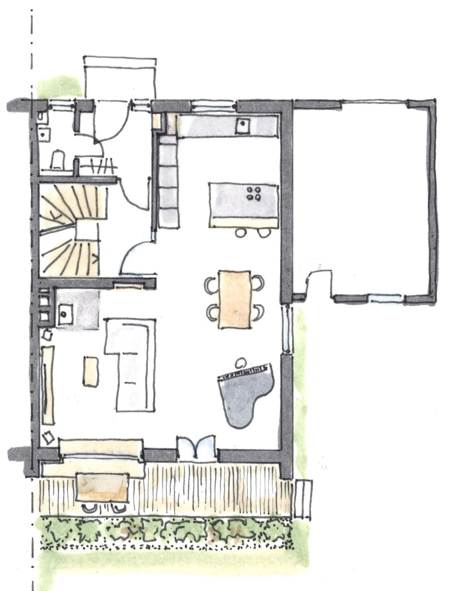 Das Elternhaus aus den 1970er Jahren entsprach mit seiner Raumaufteilung und Gestaltung nicht den Wohnvorstellungen einer jungen Familie. Gemeinsam wurde ein durchdachtes Design- und Grundrisskonzept entwickelt, das zentrale gestalterische Fragen klärte und weiterführte.