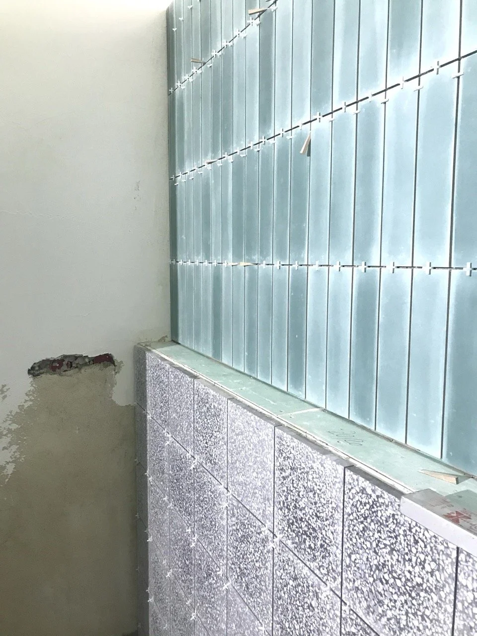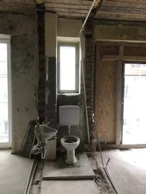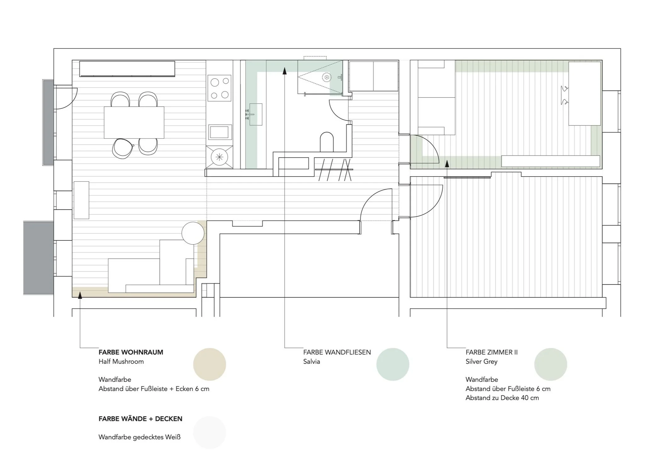 Ein französischer Balkon ergänzt nun die bodentiefe Fensteröffnung in der Küche, während ein Oberlicht über der Küchenzeile das innenliegende Bad mit Tageslicht versorgt. Grüne Wandfliesen, Terrazzo-Bodenfliesen und ein maßgefertigtes Waschbeckenmöbel verleihen dem Bad einen modernen, stilvollen Charakter.